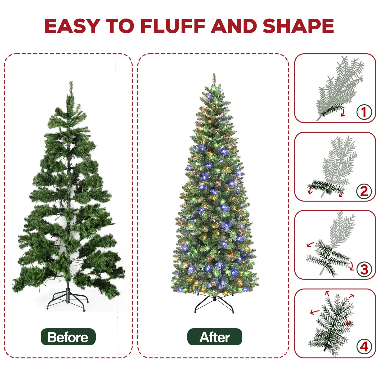Hykolity 6ft Prelit Pencil Slim Christmas Tree with 200 Color Changing LED Lights, 544 Branch Tips, Metal Stand and Hinged Branches, 10 Color Modes
