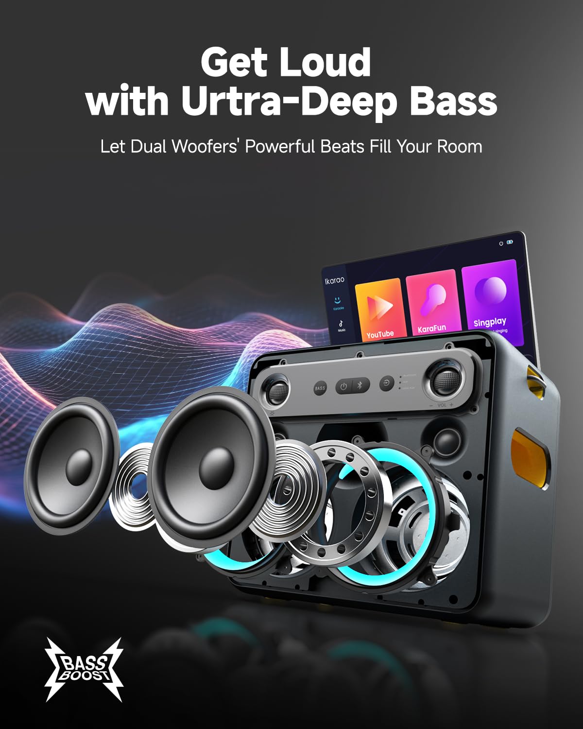 Ikarao Smart Karaoke Machine for Adults - with Lyrics Display, 64GB Karaoke Tablet, 2 Wireless Mics, Professional Karaoke System, 300W Peak Power, 4 DJ Lights, Karaoke Speaker for Any Occasion