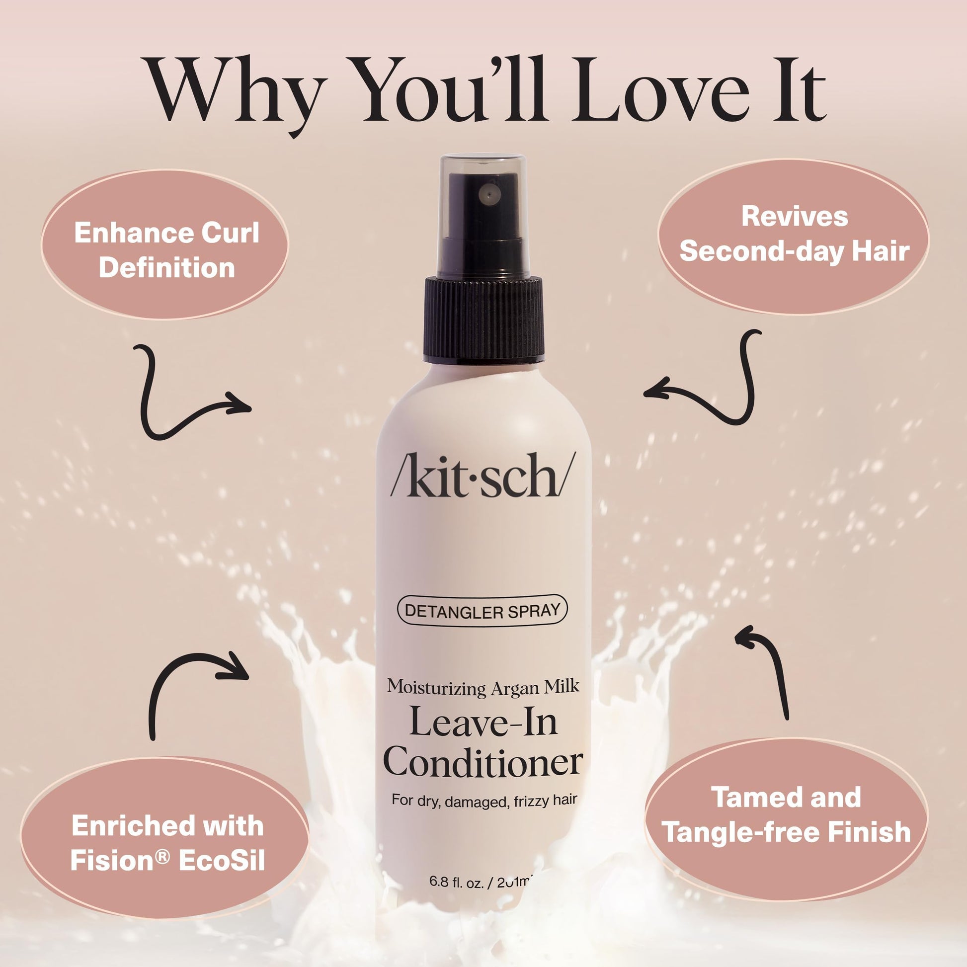 Kitsch Argan Milk Leave In Conditioner Spray – Lightweight Moisturizing Hair Spray for Women and Men - Hair Detangler Spray for Curly, Wavy, Fine, Dry & Damaged Hair - Silicone-Free - 6.8oz