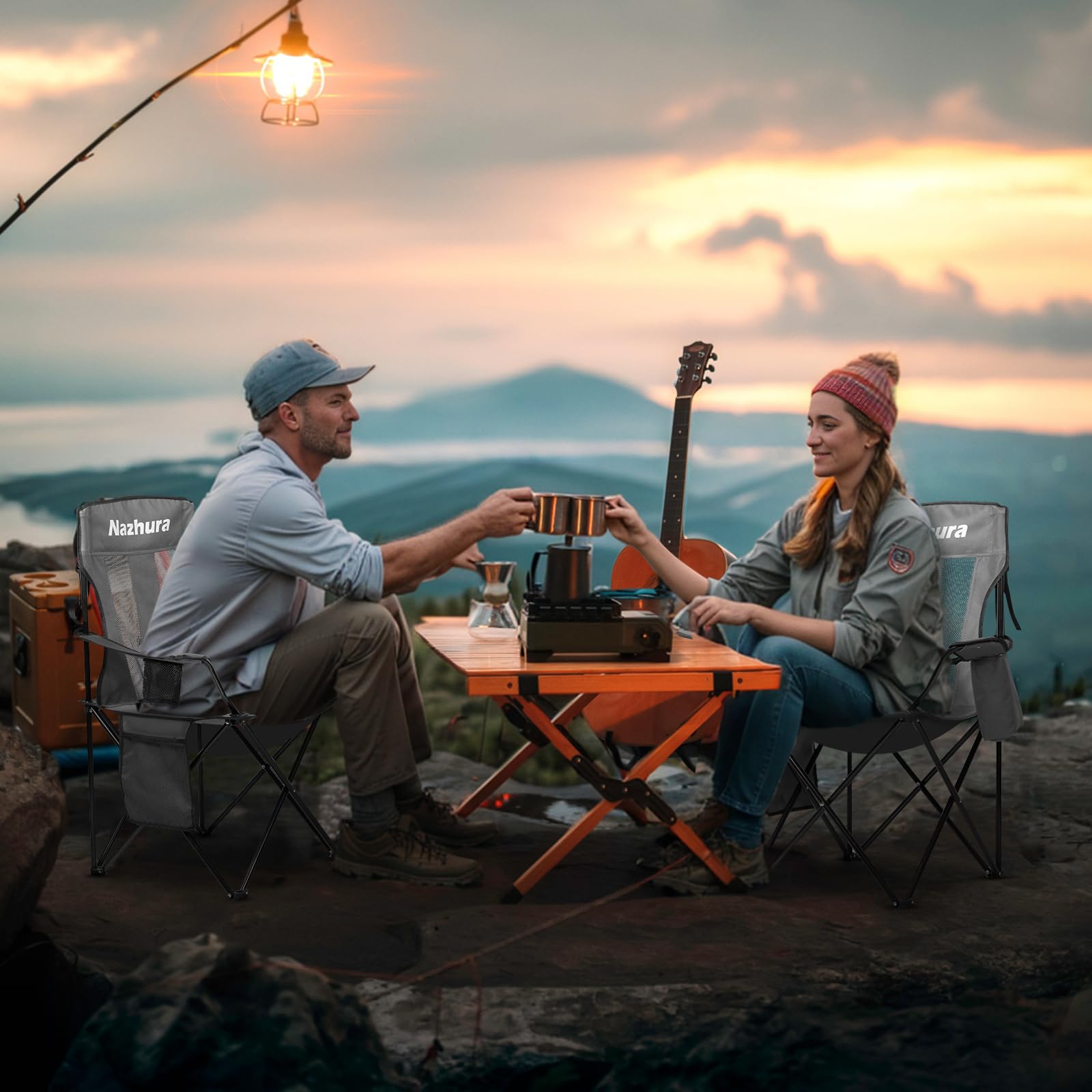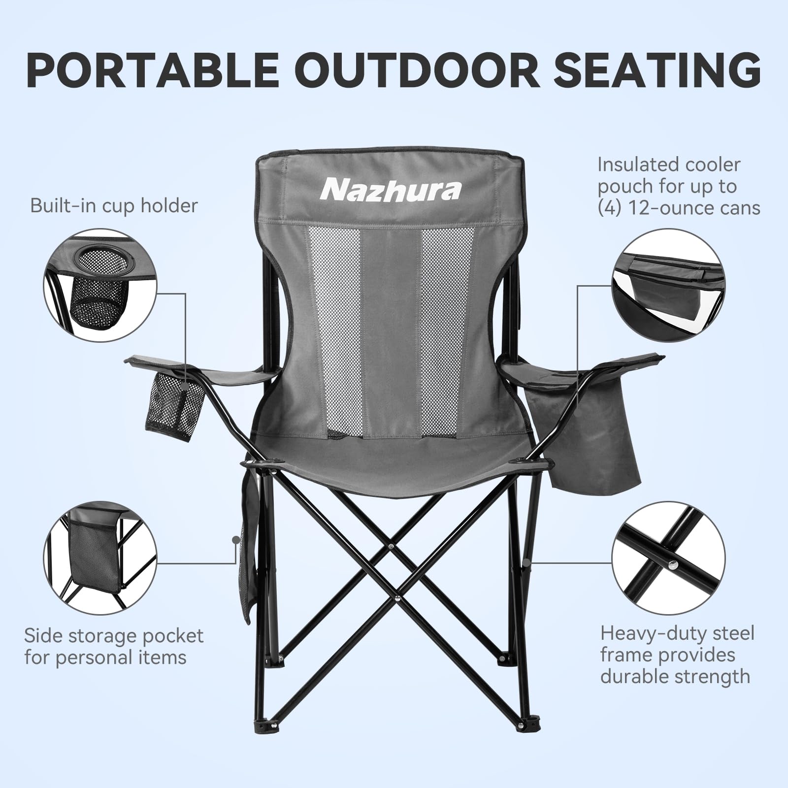 Nazhura 2 Pack Outdoor Camping Chairs Folding/Foldable/Portable with Cooler Pouch, Mesh Backrest and Cup Holder Pocket(Grey, 2 Pack)