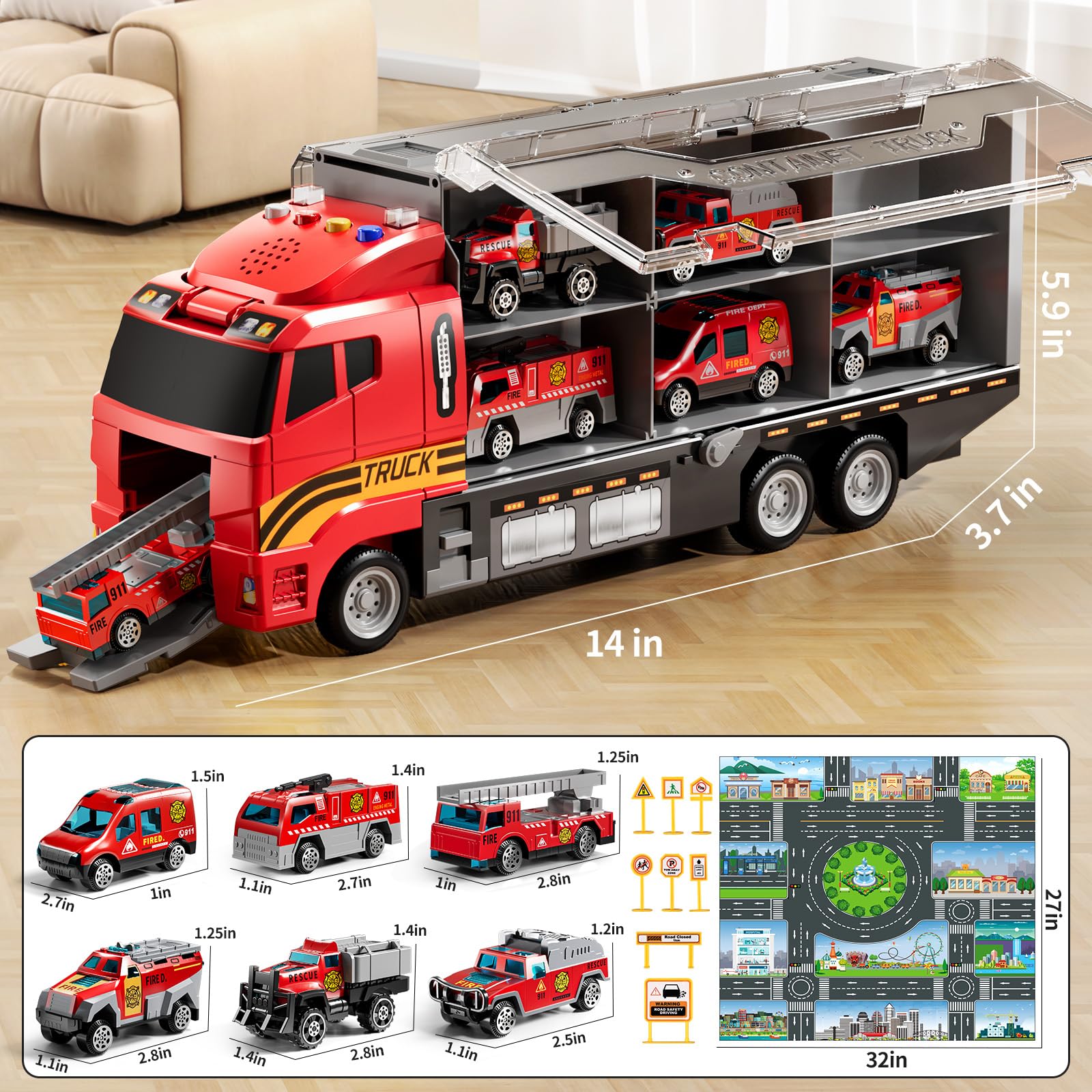 NIPLOOOW Toddler Boys Toys for 3-5 Years Old, Fire Truck Vehicle Set with Play Mat and Die-Cast Toy Car, Transport Carrier Truck for Kids 3-5, Birthday Gifts Toys for 3-8+ Year Old Boys