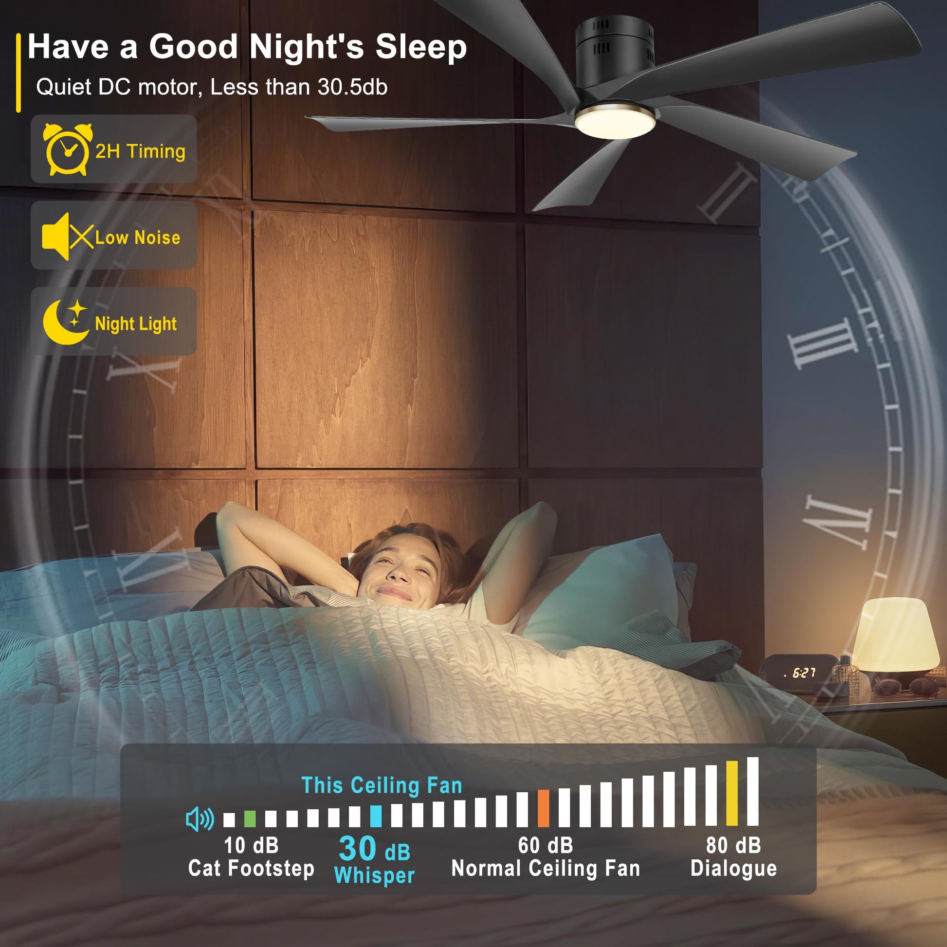 Ohniyou 52” Low Profile Ceiling Fan with Lights, Remote & APP Control Modern Flush Mount Indoor Outdoor Ceiling Fans, Dimmable, Silent DC Motor, Reversible, Black