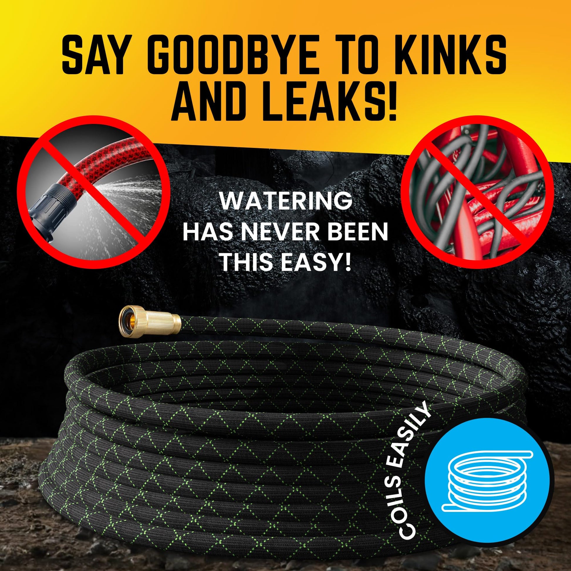 PowerFlow Garden Hose, NON-EXPANDABLE 25 Feet Premium Quality Stainless Steel Metal Water Hose with Durable Fabric Skin, Hose For Commercial, Residential Use, Bonus 10-way Spray Nozzle (25 Ft, Black)