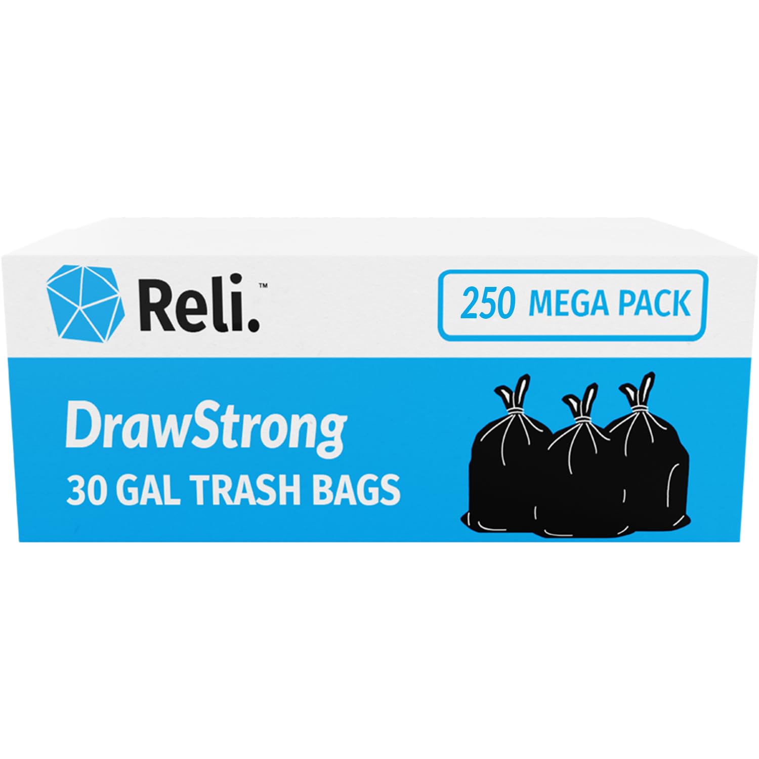 Reli. 30 Gallon Trash Bags Drawstring | 250 Count Bulk | Black | 30 Gallon Garbage Bags Heavy Duty | Large