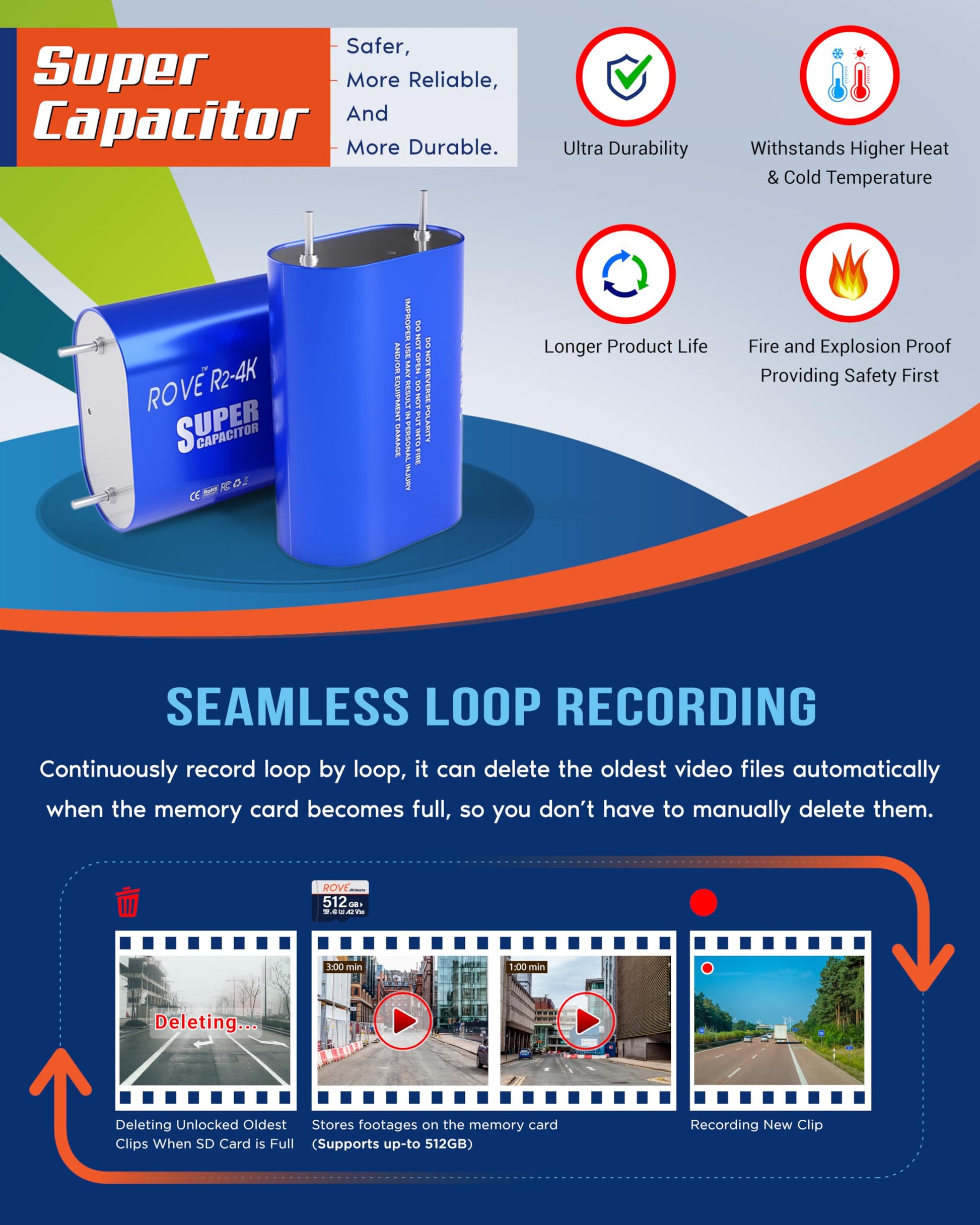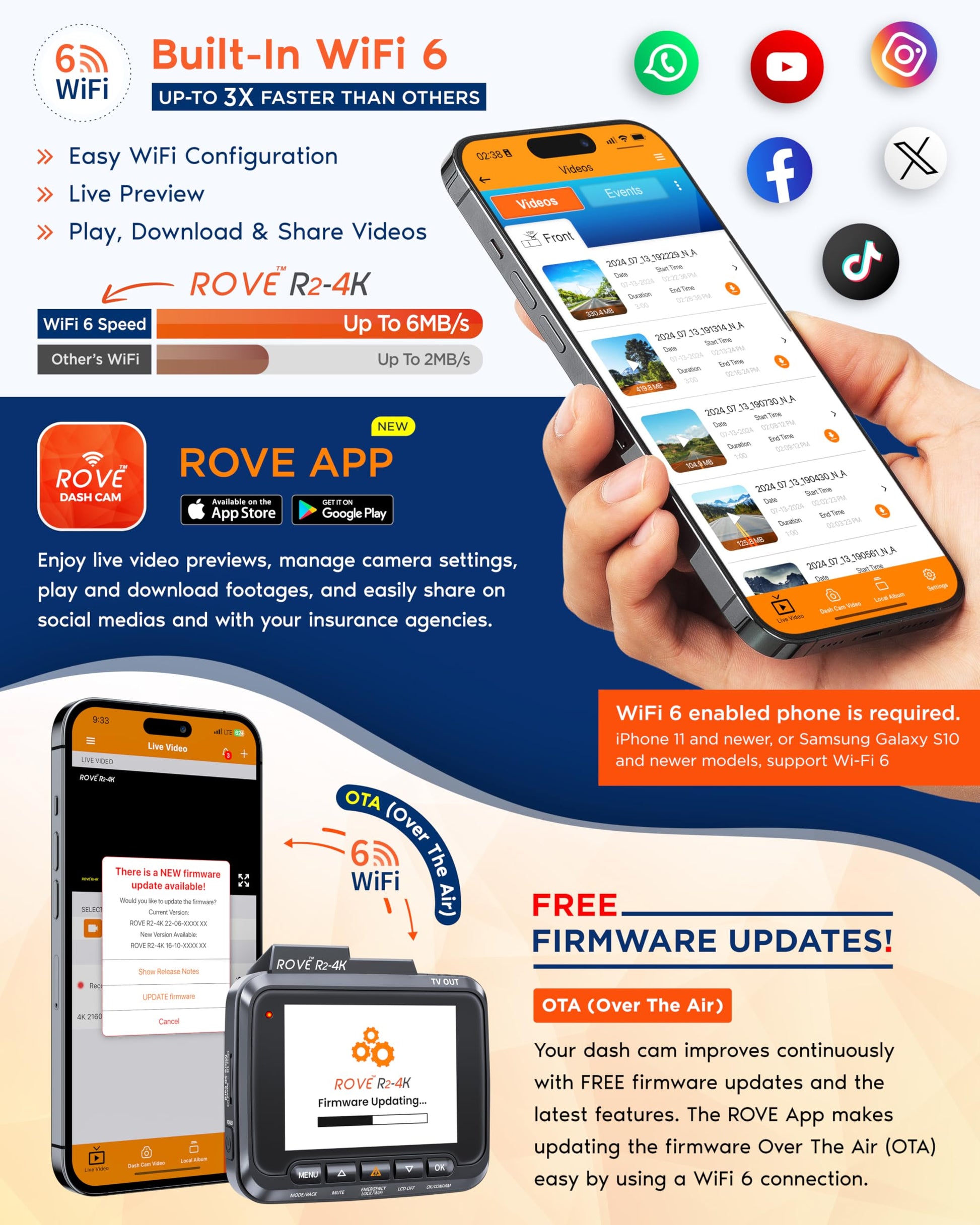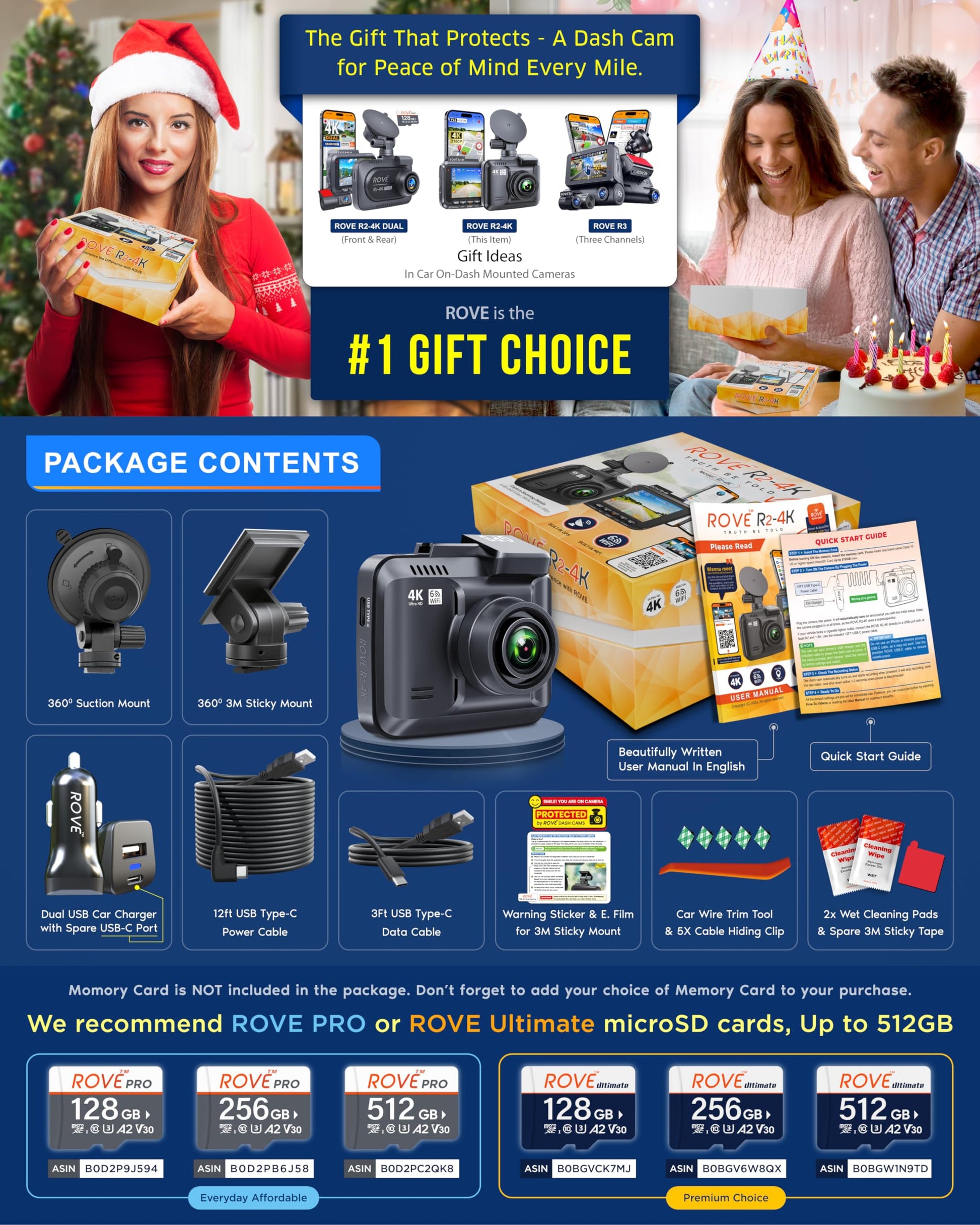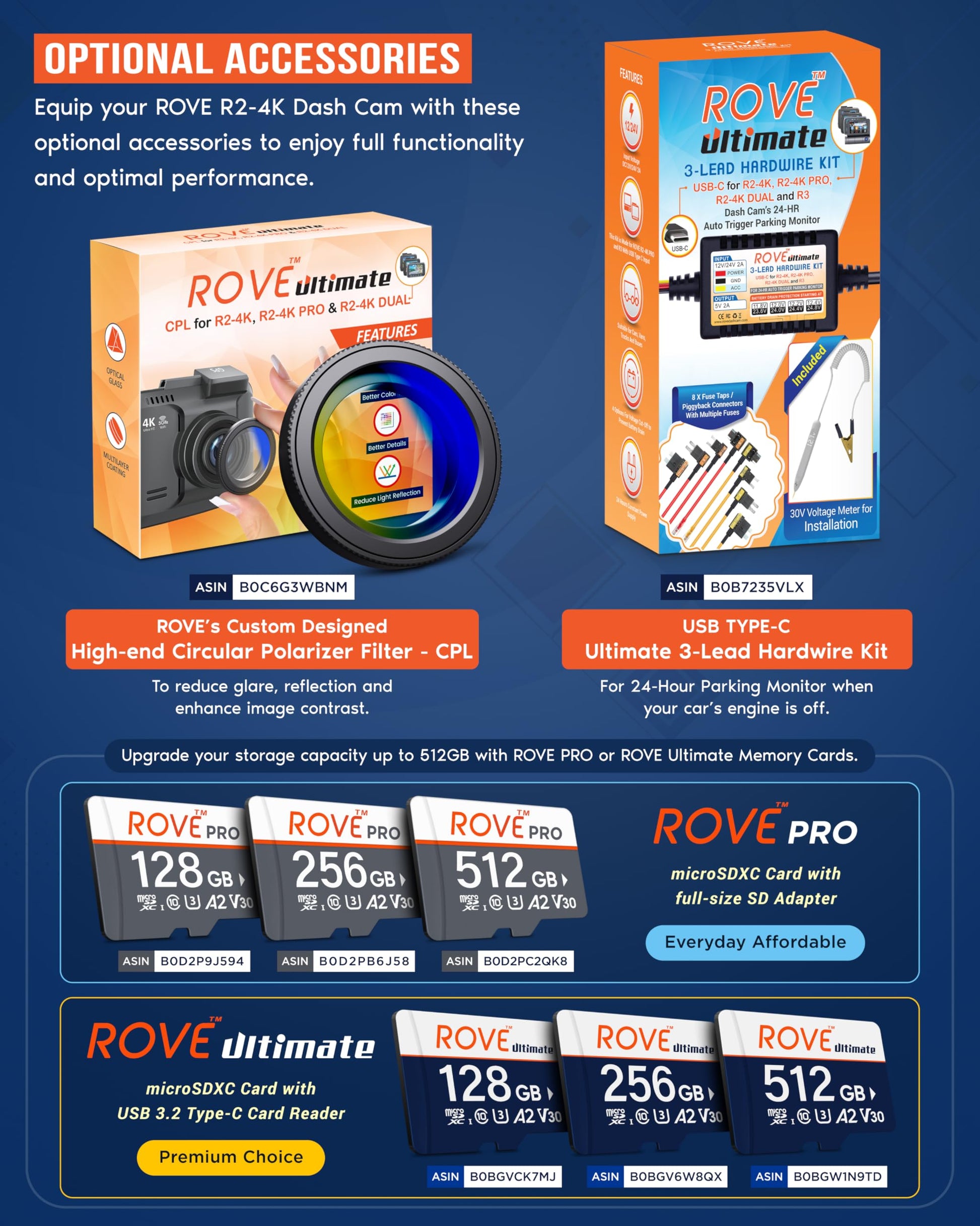 ROVE R2-4K Dash Cam Built-in WiFi 6 GPS Car Dashboard Camera Recorder with UHD 2160P, 2.4" IPS Screen, 150° Wide Angle, WDR, Night Vision