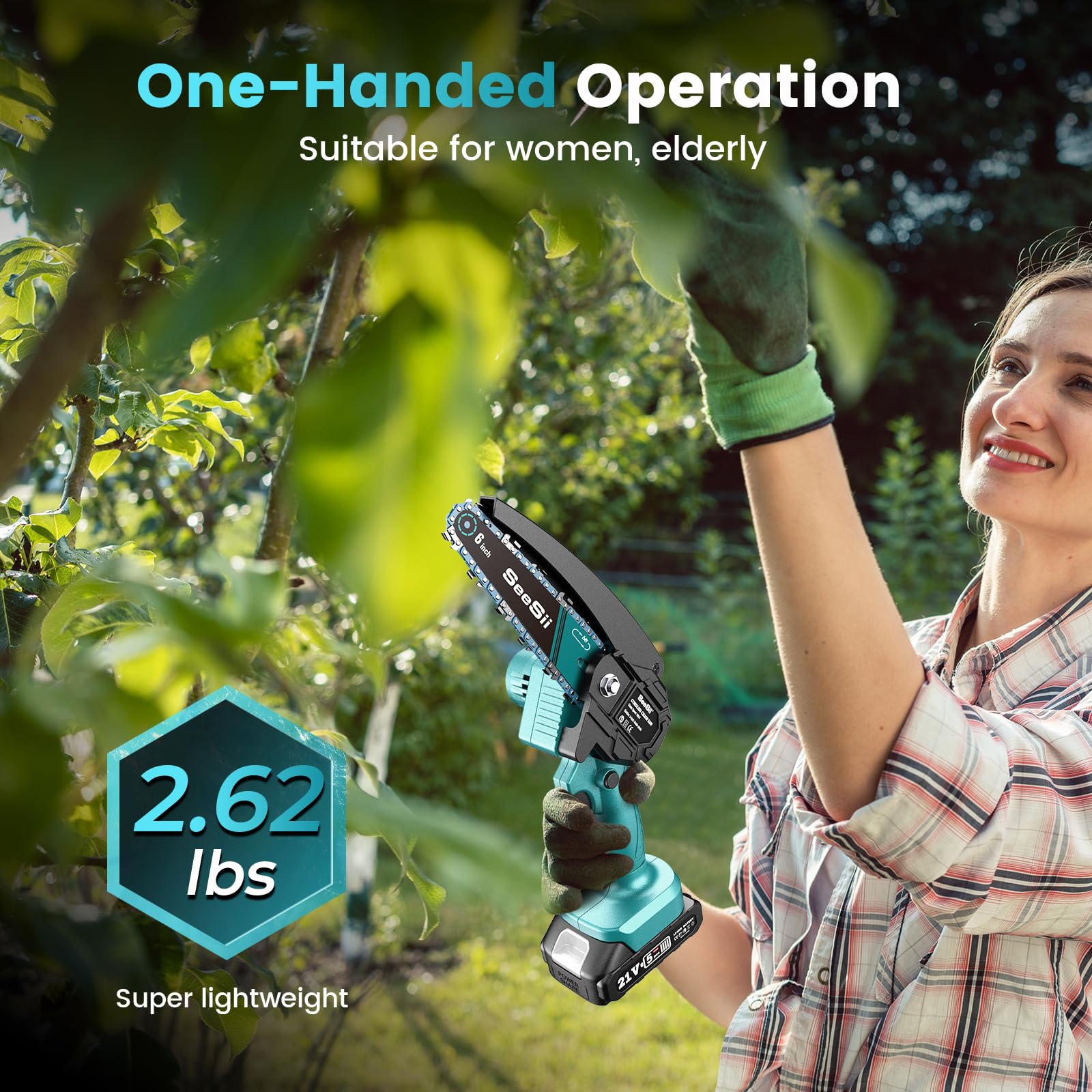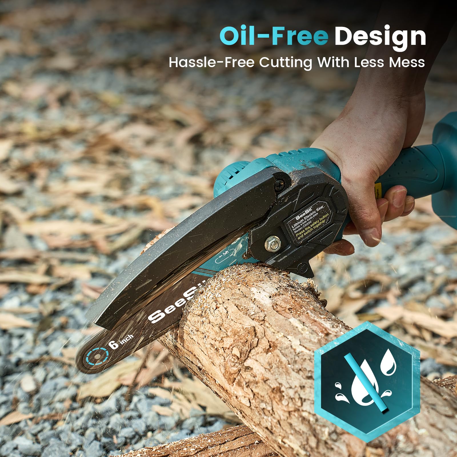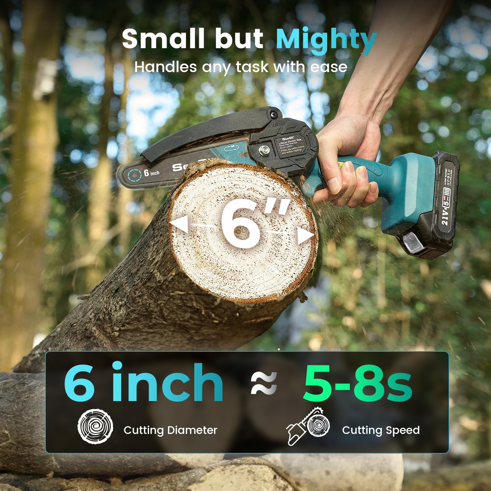 Seesii Mini Chainsaw Cordless 6-inch, Handheld Electric Power Chain Saw with 2 Batteries, for Tree Trimming Wood Cutting, Best Gifts for Dad, Husband