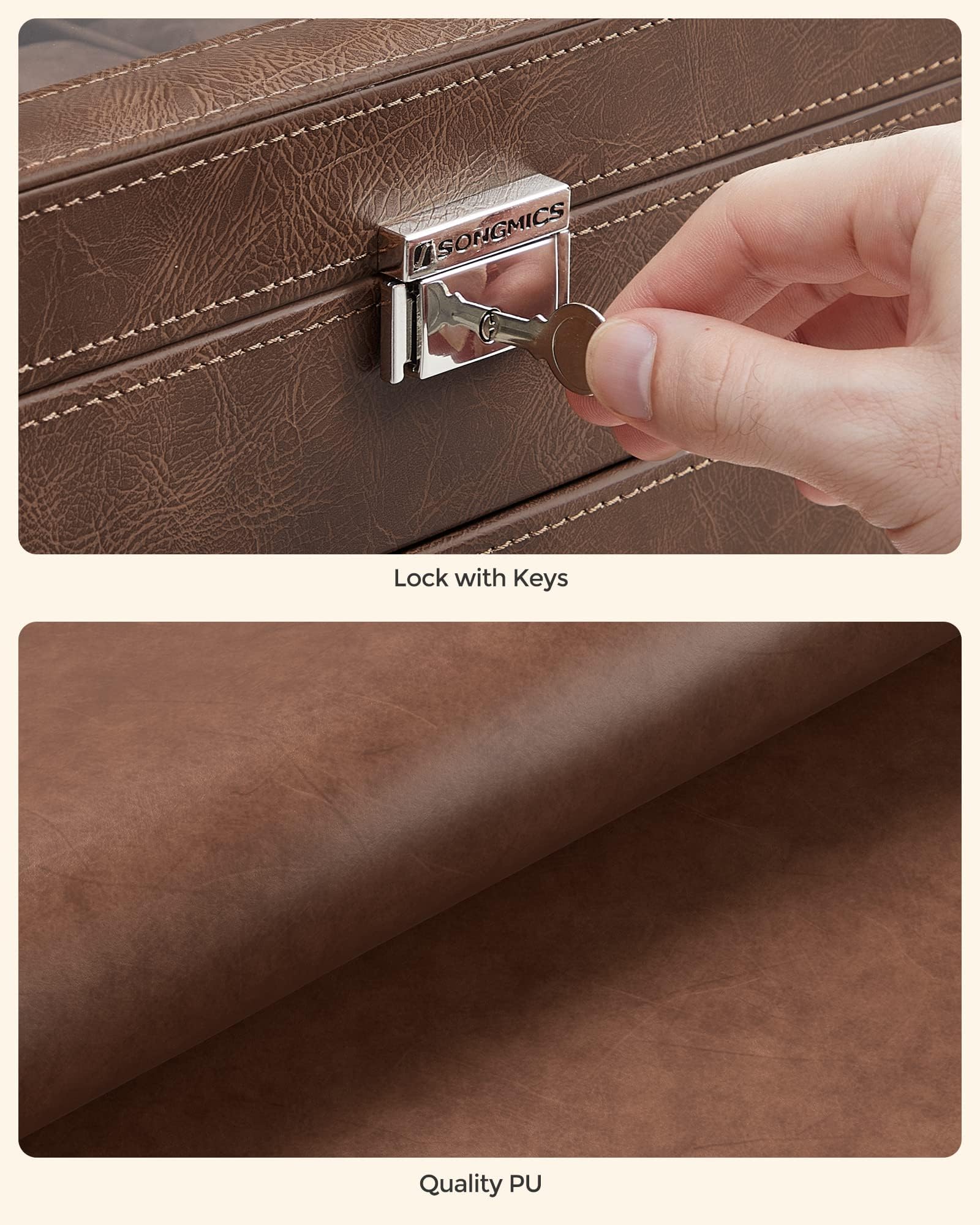SONGMICS 12-Slot Watch Box, Lockable Watch Case with Glass Lid, 2 Layers, with 1 Drawer for Rings, Bracelets, Gift Idea, Brown Synthetic Leather, Brown Lining UJWB012K01