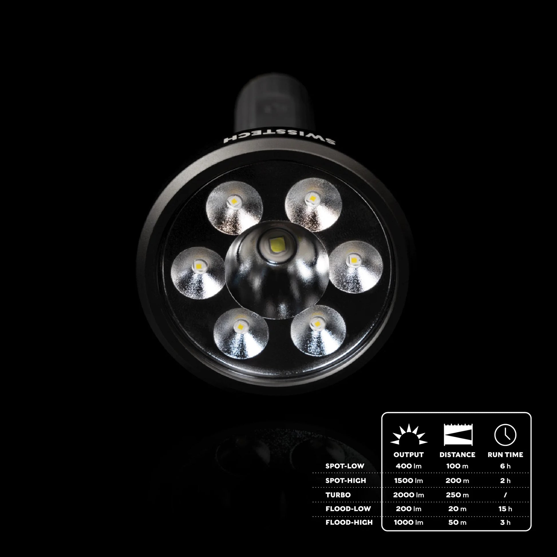 Swiss Tech Steigern 2000 Lumen LED Rechargeable Flashlight, IPX7 Waterproof, Digital Focusing