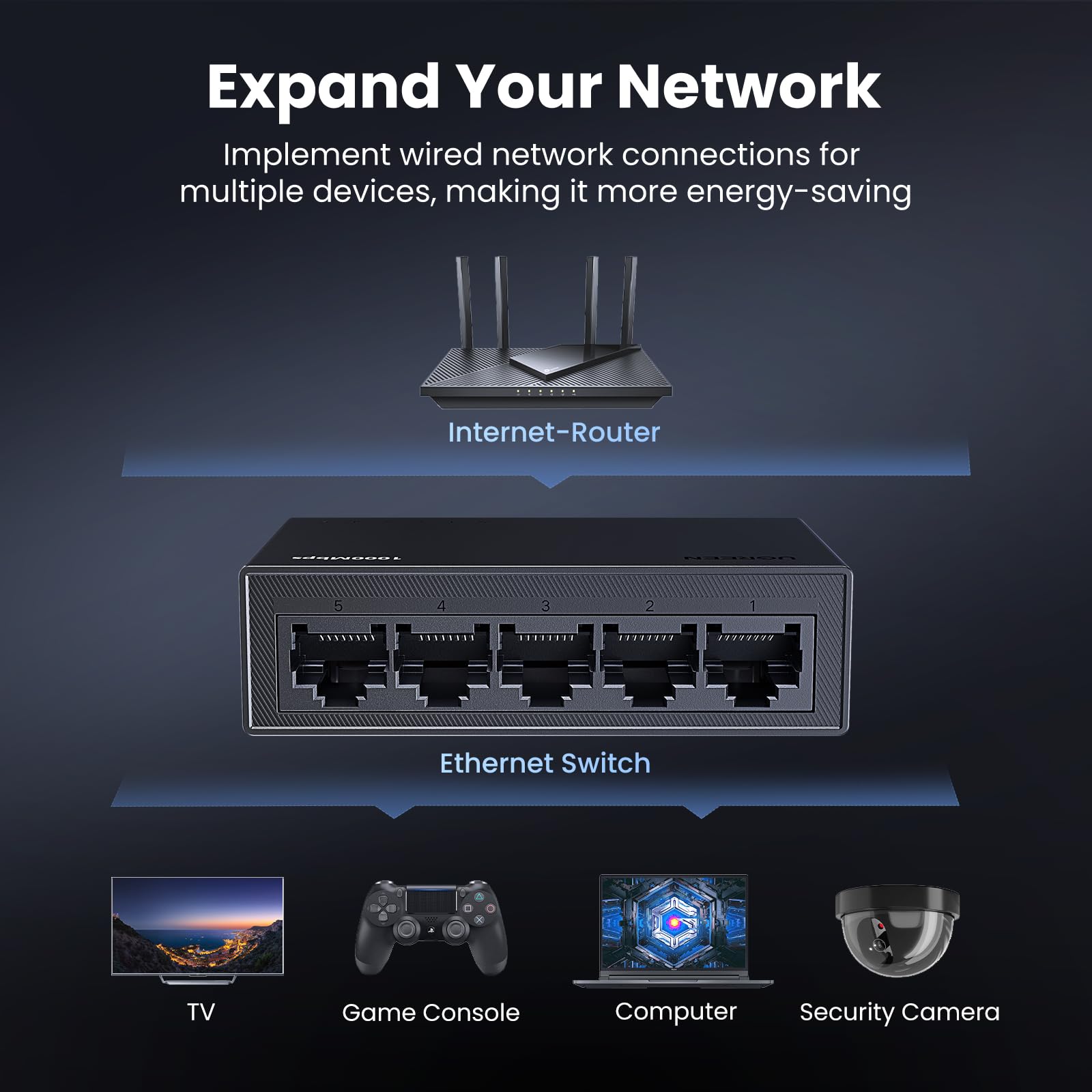UGREEN Ethernet Switch, 5 Port Gigabit Ethernet Splitter, Plug & Play, Wall Mount & Desktop Network Switch Hub, Unmanaged, Compact, with LED, Fanless Quiet, for Internet Cable, Laptop, Router, NAS