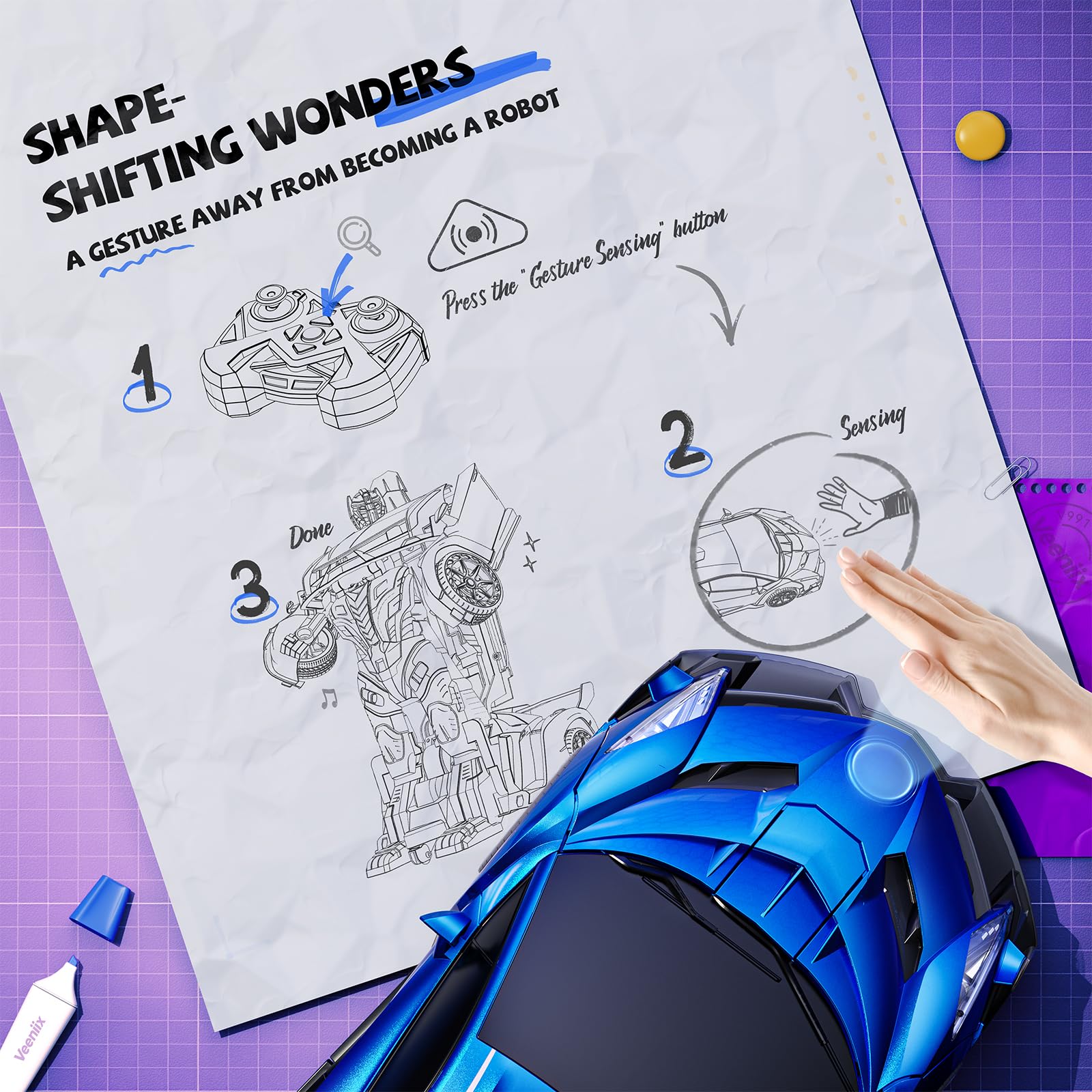 Veeniix V991 Transform Remote Control Car, 1:10 Big Size, 2 Rechargeable Batteries for 70Min, 2.4GHz Gesture Sensing, One-Key Deformation, Robot Toys Gifts for Boys and Girls (Blue)