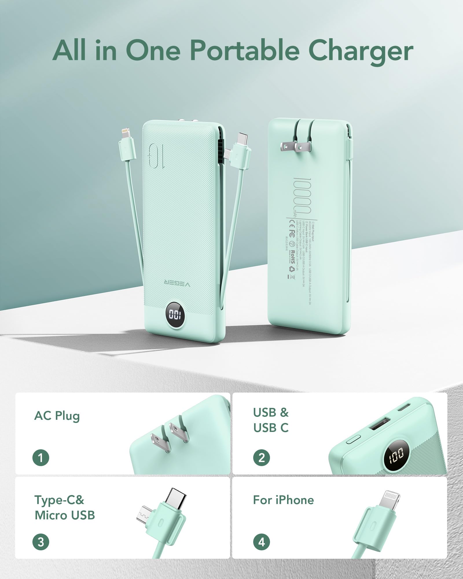 VEGER Portable Charger for iPhone with Built in Cables and Wall Plug, 10000mah Slim Fast Charging USB C Power Bank, Travel Essential Battery Pack Compatible with iPhone, iPad, Samsung etc(Green)