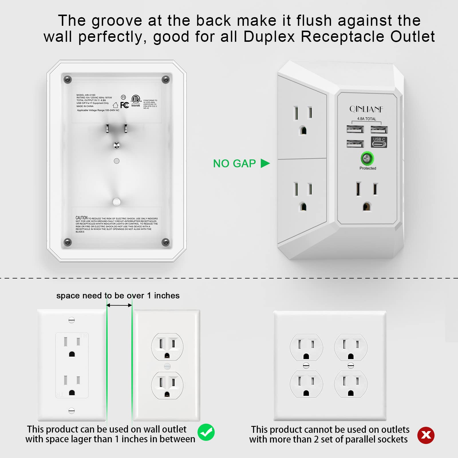 Wall Charger, Surge Protector, QINLIANF 5 Outlet Extender with 4 USB Charging Ports (4.8A Total) 3-Sided 1680J Power Strip Multi Plug Adapter Spaced for Home Travel Office (3U1C)