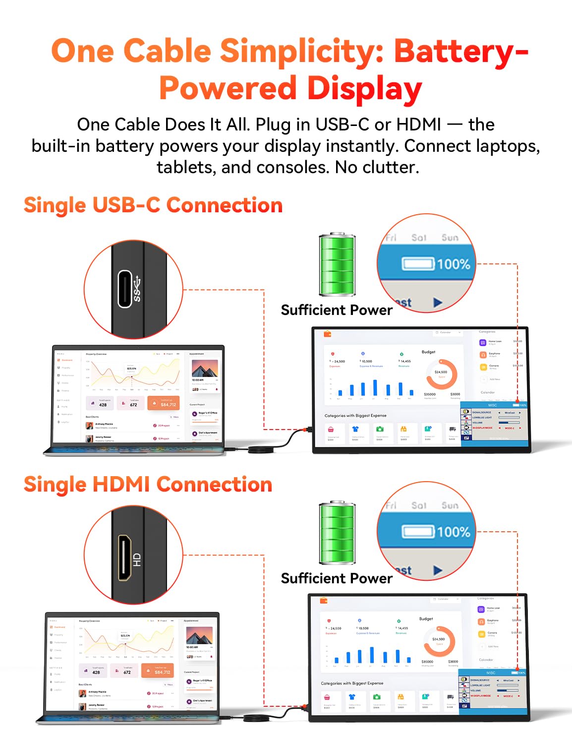 Wireless Portable Monitor Battery-Powered, Support AirPlay Miracast, 15.6" 1080P IPS Monitor USB-C HDMI External Display, 2nd Screen for Laptop MacBook PC Phone Tablet, w/Built-in Battery(4- 5H)
